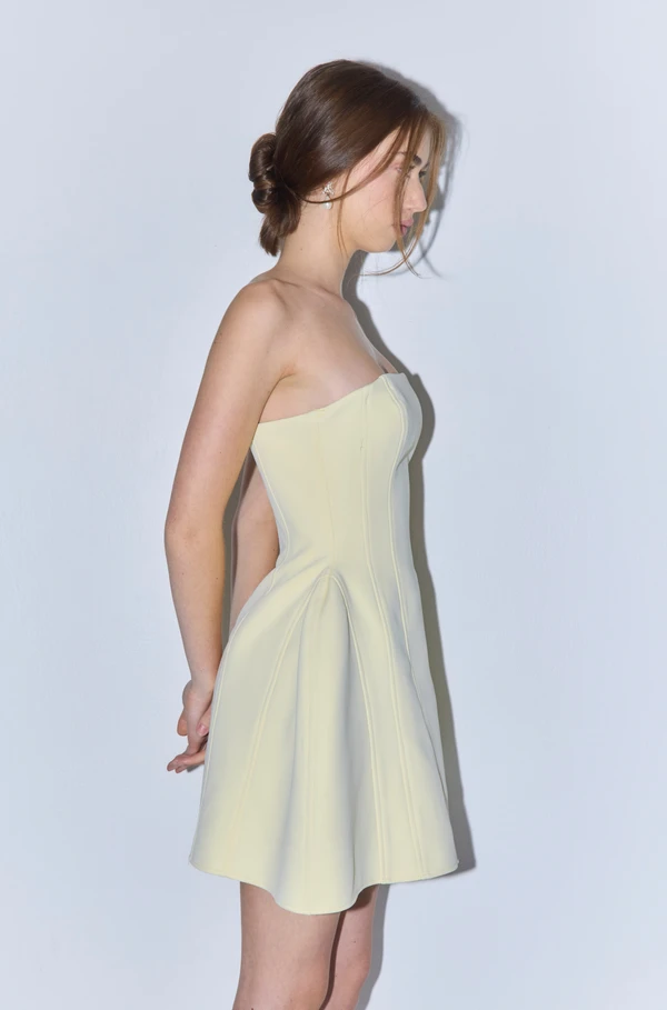 שמלת ערב סטרפלס בצבע צהוב בננה